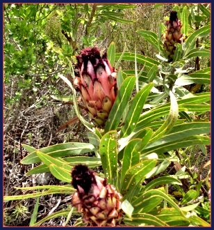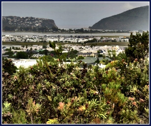 I climbed the steep slope on a trail called Memory Lane that took me along a path under the trees, until I reached a protea and fynbos area where I had magnificent views across the Knynsa Lagoon over Thesen Island and Leisure Isle to the Heads.