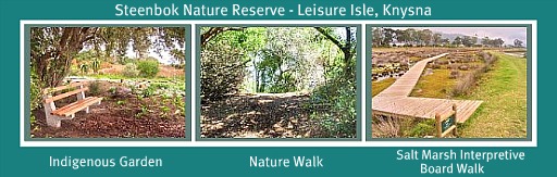 Steenbok Nature Reserve is a joint initiative by the Leisure Island Residents Association and the Knysna Municipality. Two areas Steenbok Nature Park and Kingfisher Creek have been combined to form one stretch of natural parkland. Lying on the northern shores of Leisure Isle in the beautiful town of Knysna, these small but precious areas of water-edged nature have a wealth of flora and fauna, and an abundance of tranquility.