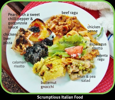 A beef ragu with mushrooms and fennel called “Carni Milanese” was the signature dish of Puccis. Esther said it had been a dish her mother made. Puccis also made a delicious pear dish incorporating Gorgonzola cheese and sweet chilli sauce. Then there was butternut gnocchi, calamari risotto, bean and pea salad, summer salad, chicken penne, asparagus risotto, polenta ragu and garlic focaccia.