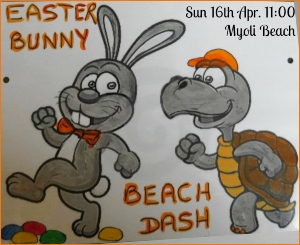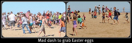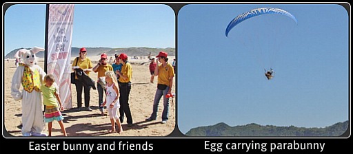 The excitement was at fever pitch when the flying Bunny in his motorised paraglider came into sight over the dunes. In spite of being organised into 4 groups the enthusiasm could not be contained when the first eggs dropped from the sky and fleet-footed children just rarin' to go, raced across the sands to grab their chocolate prizes as they fell to the beach.