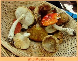 The edible Noble mushroom is found near cow dung or animal dung on lawns but a poisonous version looks the same. Purple-stemmed russulas are very peppery and not tasty to eat. Chicken of the Woods is a bracket fungi that grows to a large size and can weigh up to 45 kgs. It is found on Eucalyptus and Oaks. It is orange on top and white underneath growing in a semi circular shape around tree trunks. It tastes like chicken when eaten.