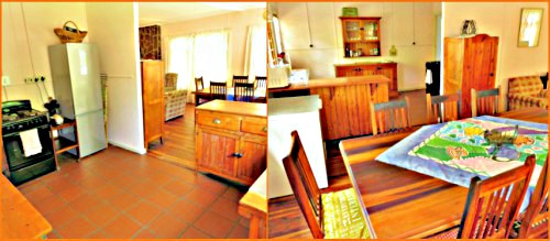 Open-plan Lounge and Dining-room with Sun-room at front of the house looking out at the poolThe kitchen is well equipped.There is a full 4 plate stove and oven, microwave oven, fridge/freezer and separate deep-freeze. All the regular crockery and cutlery is supplied along with a toaster and kettle. An outdoor braai is also provided.
