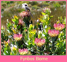 Shrews, snakes, dassies, moles, molerats, dormice, rats and gerbils all contribute in some way to fynbos life as do many bird species amongst them, Protea canaries, Cape Sugarbirds, Orange-breasted sunbirds, Cape Rockjumpers and Victorin's Warblers that are endemic to this biome.