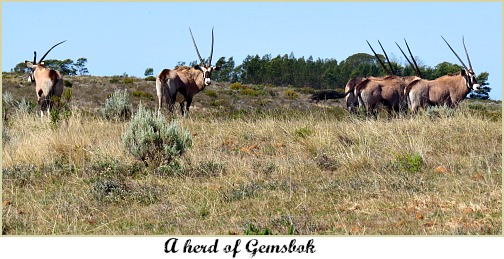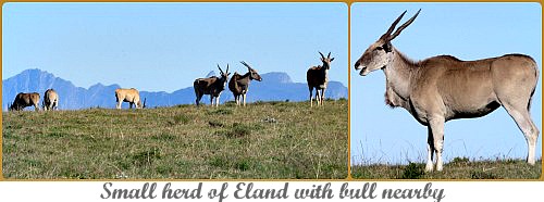 Adjacent to the burnt area were several numbers of protea bushes in flower mixed among the ericas typical of fynbos. In the distance we spotted a lone buffalo and a few Red Hartebeest. Once inside the gates of Gondwana Game Reserve, the first sighting we had was of a small herd of Eland with a striking bull close by keeping a careful eye on them.