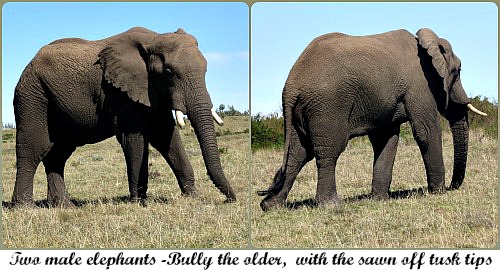 In open grassland we came across a large elephant called Bully that because of his bad habit has had his tusk tips removed. A younger male was amicably accompanying him.