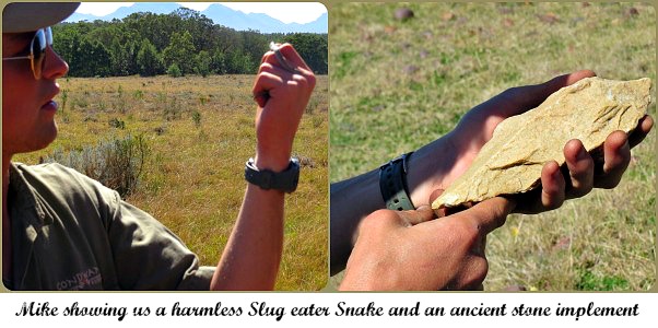 In short-grassed rocky area Mike pointed out the rounded stones that were naturally found there. He then searched for and found quite easily a number of tear-drop shaped sharpened stones that he explained had been carried there and were tools crafted by the early hunter/gatherers that walked over the mountains, across the plateau and down to the sea. Not far away is the discovery of their existence at Pinnacle Point near Mossel Bay and those archeological digs are strongly suggesting that this place could really be the cradle of mankind.