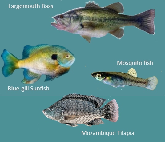Largemouth Bass and Mozambique Tilapia were introduced for angling, Bluegill Sunfish as a fodder fish, and Mosquito fish to control mosquitos.