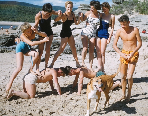 Unknown, Lilith Emslie, Lilith Bond, Joan Emslie, Marion Streeter, * Ken Symonds and Max Chappel * kneeling, Chris Callaghan & Rusty.Those youthful gatherings with other families who had cottages in Sedgefield created friendships that remain to this day, even though they are scattered all over the world. Swimming was always the main activity and surging in and out of the mouth with the tide was a great part of the attraction.