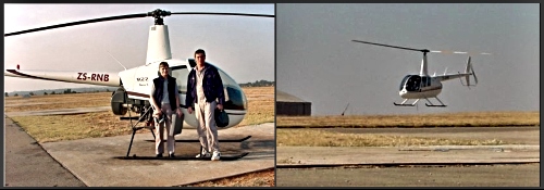 Lilith with instructor, Louis Nel / Lilith's first solo flightIn 2002 this already accomplished aviator decided to try something new. Lilith learned to fly a helicopter just for the fun of it. Her instructor at Grand Central Airport in Johannesburg was Louis Nel. Of course, she got her private pilot license but was too busy flying planes for a living to do more than that!