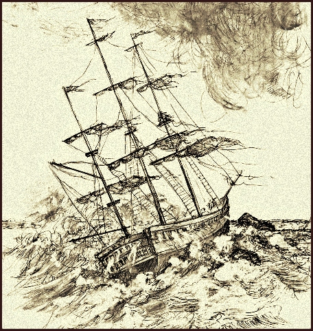 For 3 days and nights the waves pounded the trapped ship unmercifully while the crew huddled together for warmth, crouching aft as best they could, to shelter from the wrath of the angry waves. For their safety, the female passengers were carried up the tall masts and lashed to the cross trees. Periodically the crew climbed the rigging to give the luckless exposed captives onions and raw pumpkin which was all they could offer them as the galley was under water and most of their provisions had washed overboard..