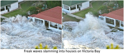 Closer to Home - In mid January 2011 seismic activity 50 kms off-shore caused a mini Tsunami to hit Victoria Bay, the surfers' paradise between Wilderness and George. It slammed onto the road that runs next to the ocean with such force that if any car or person had been there they would have been washed into the sea with little hope of being rescued alive from the violent water.