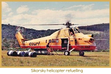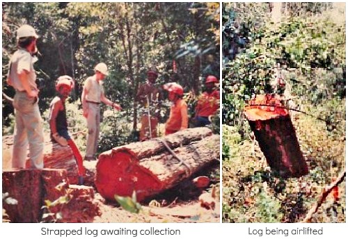 One or two days a year, a Sikorsky helicopter would be hired to airlift out expensive timber that was in an extremely difficult place for the Percheron horses to get to or too heavy for them to drag out.