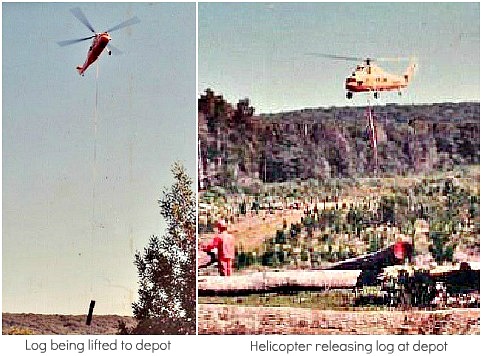 As the Sikorsky hovered, a steel cable was lowered and a man on the ground would run in and attach it to the log that had a strap around it.