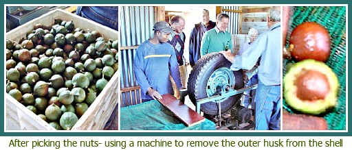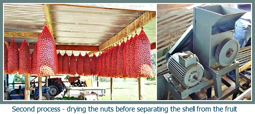 Robert has devised a machine that separates the husks from the shells. The shells then have to be dried before another machine removes them from the kernals/fruits that are also dried before they are packaged.