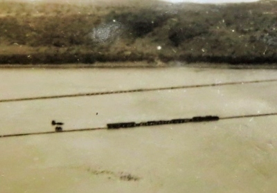 Train crossing over the Swartvlei on a flooded railway line Dec. 1952-Photo taken from the Watney's house on Cloud 9. The new road was barely above water.Elaine bought “Aqua Vista” the home of school teacher, Jacob Muller (cnr Flamingo Road and Kingfisher Drive) enabling her to move into town. She changed the name to Sandgate.