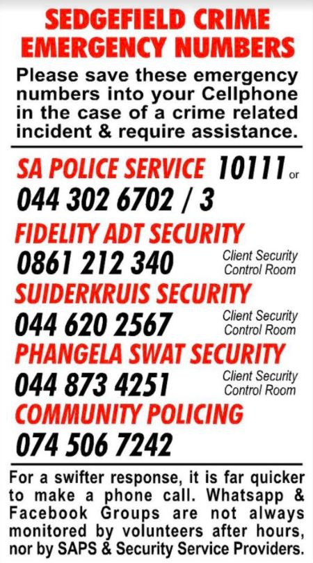 The aim of Sedgefield Ratepayers and Residents Association is to do everything possible to maintain and protect Sedgefield and its environment and to address the expressed needs and concerns of the community through constant dialogue and negotiation with the relevant authorities for the greatest benefit of all its residents.